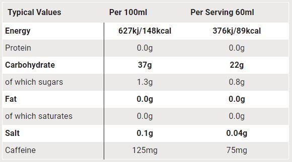 - Cung cấp 22g carbohydrate cùng 75mg caffein trong gói 60g